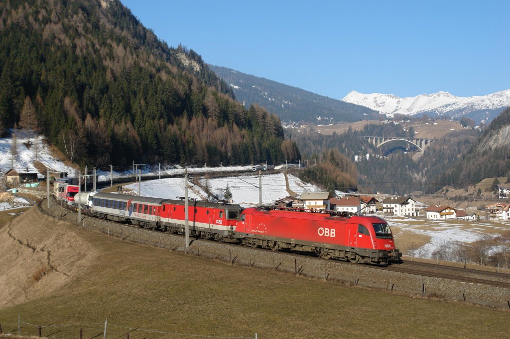1216 019 + 1144 237 mit einer Rola von Italien nach Wörgl Terminal am 08.03.2011 unterwegs bei St. Jodok am Brenner.