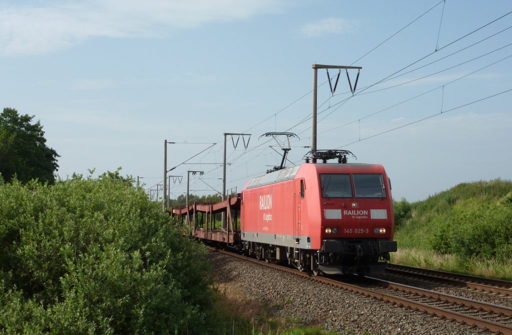 145 025-3 fuhr am 28.06.2012 mit einem Güterzug von Emden nach Osnabrück, hier bei Veenhusen.