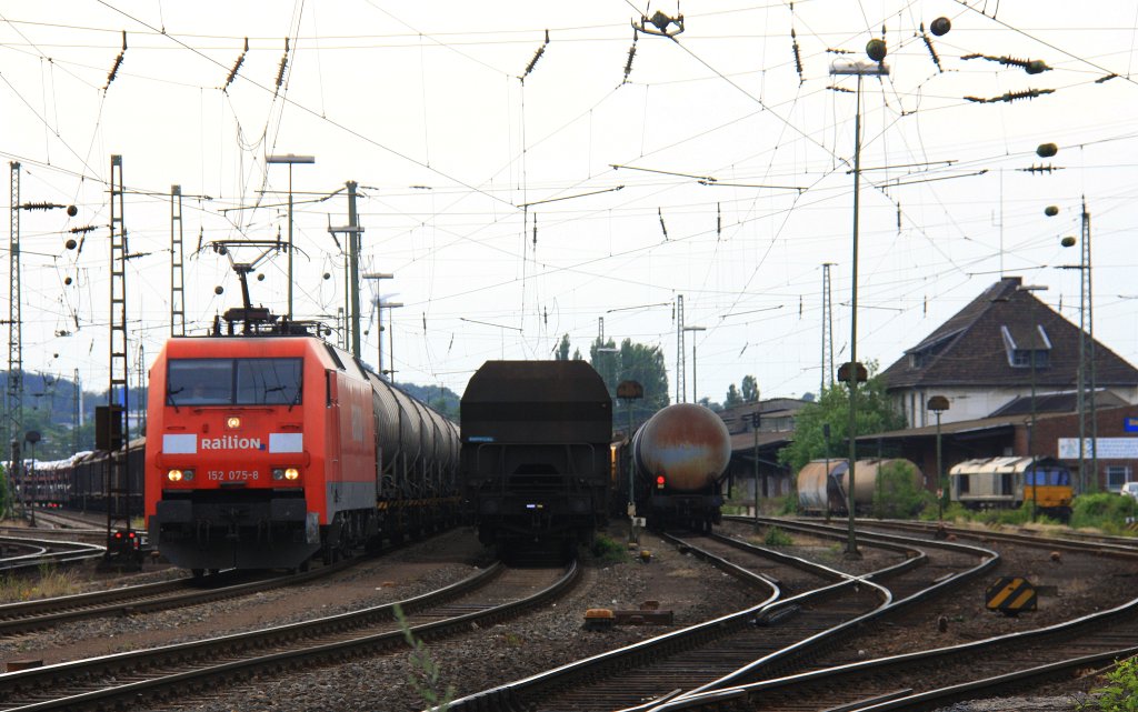 152 075-8 von Railion fährt mit einem Kesselzug aus Antwerpen-BASF(B) nach Ludwigshafen-BASF bei der Ausfahrt in Aachen-West und fährt in Richtung Köln bei Sonnenschein am 28.6.2012.