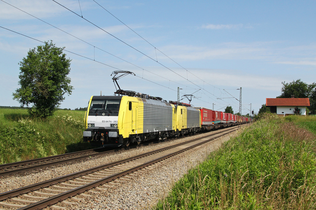 189 203 + 189 924 mit einem KLV Zug am 23.06.2012 bei Hilperting.