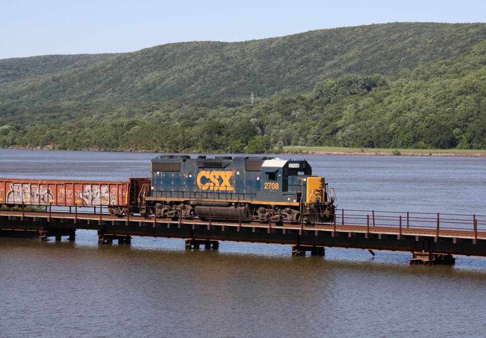 27.6.2012 Bear Mountain State Park, NY. CSX 2708(an der Spitze CSX 2731) mit einem Nahgüterzug (12 Wagen) Richtung Kingston, NY überfährt die Einmündung des Popolopen Creek in den Hudson River. Im Hintergrund die Hudson Highlands, Ostseite.