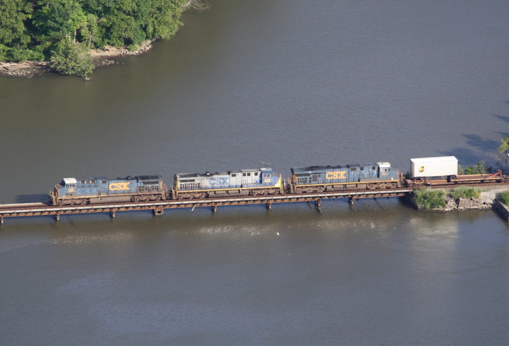 27.6.2012 Bear Mountain State Park, NY: CSX 598, 405, 5501 überqueren die Einmündung des Popolopen Creek in den Hudson River Richtung NY/NJ. Aufgenommen ca. 1km gegenüber von den Hudson Highlands / Anthonys Nose. Loktypen lassen sich leicht per google finden.
