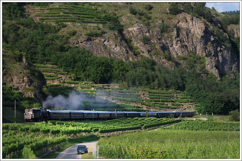 33.132 auf dem Weg zur Sonnwendfeier in der Wachau mit ihrem Sonderzug SR 17164 (ab Krems als R 17144) von Wien Heiligenstadt nach Spitz an der Donau, aufgenommen zwischen Dürnstein und Weißenkirchen. Im Gegensatz zu den vorangegangenen Jahren wurde die Lok diesmal bereits vor der Weiterfahrt von Krems nach Spitz in Krems gedreht, damit sie für die Rückfahrt wieder „richtig“ steht. Da das grüne Auto vom Kollegen Stephan Kainberger eigentlich nicht wirklich stört, habe ich es nicht weg gestempelt ;-)