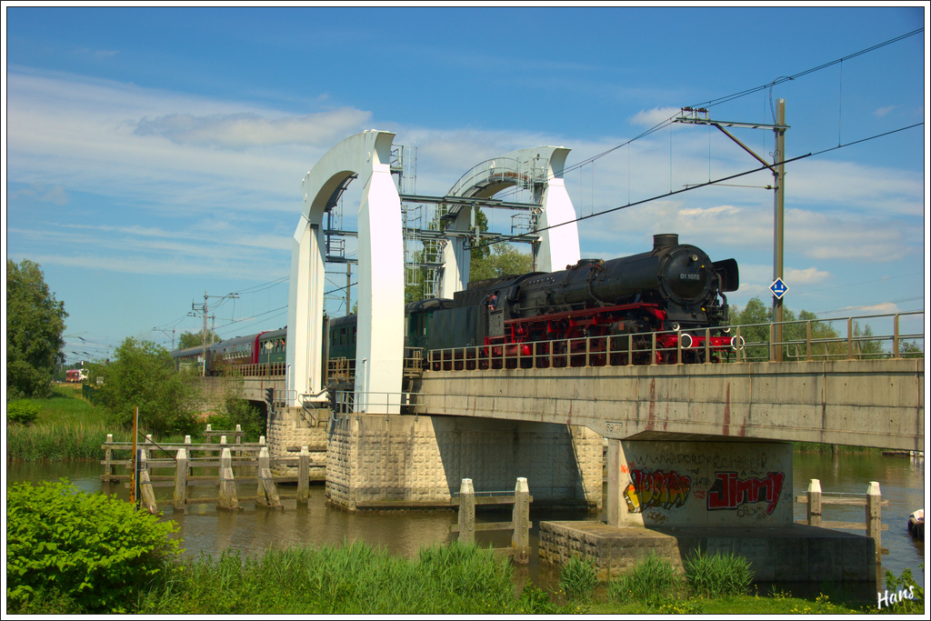 Der Pendelzug mit den Dampflokomotiven 01 1075 und 65 018 auf der Wantijbrücke am 2. Juni 2012. Der Sonderzug wird nach links auf ein Industriegelände abbiegen, danach kann der wartende Regionalzug von Arriva weiterfahren.
