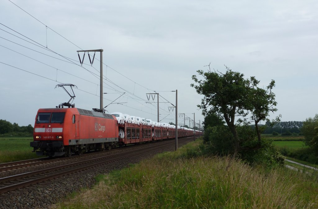 Die 145 017-0 fuhr am 28.06.2012 mit einem Güterzug von Osnabrück nach Emden, hier bei Veenhusen.