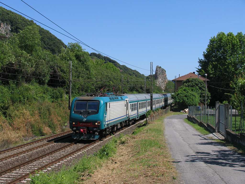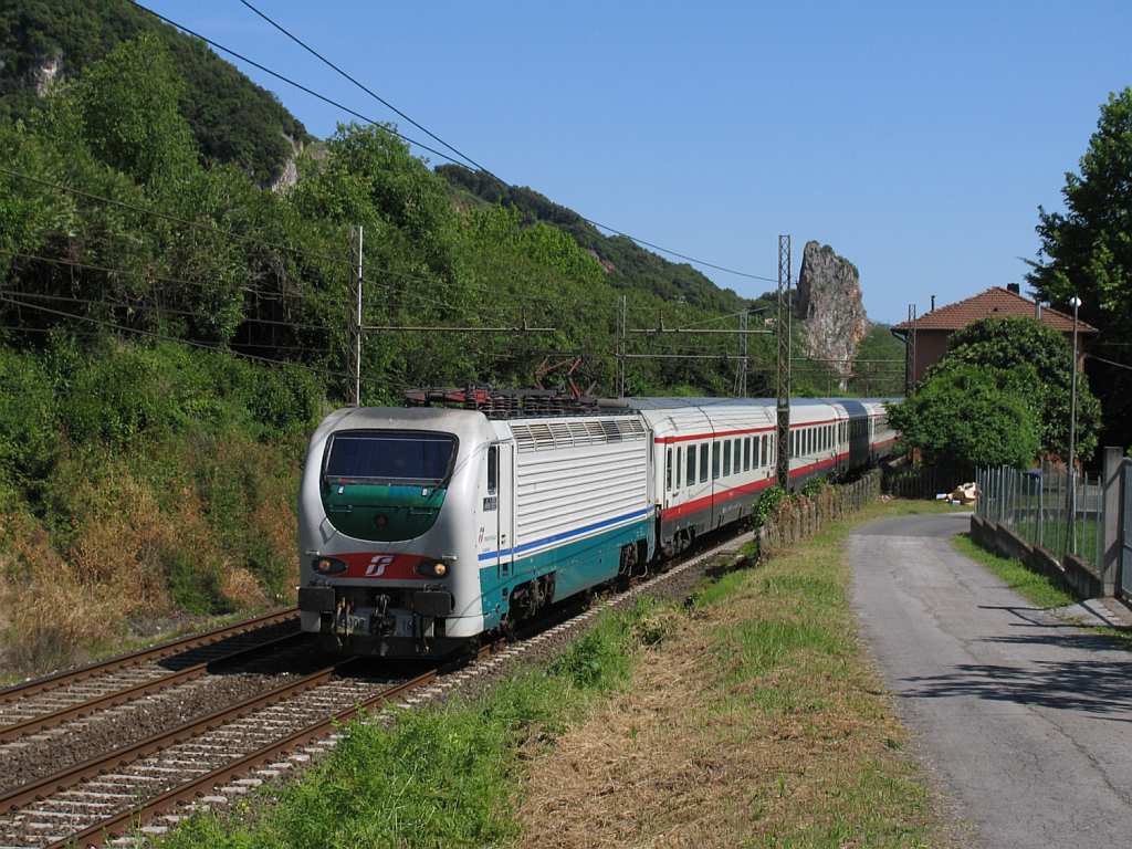E402B.166 mit ES 9768 Roma Termini-Milano Centrale in die Nähe von das ehemalige Bahnhof Montignoso am 17-5-2012.