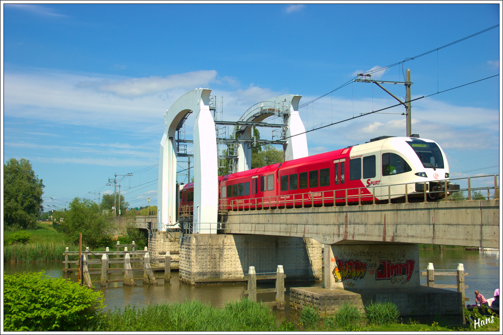 GTW 2/8 505 'Andries Dirk Copier' von Arriva ist bei der Wantijbrücke unterwegs als Regionalzug nach Dordrecht, 2. Juni 2012.