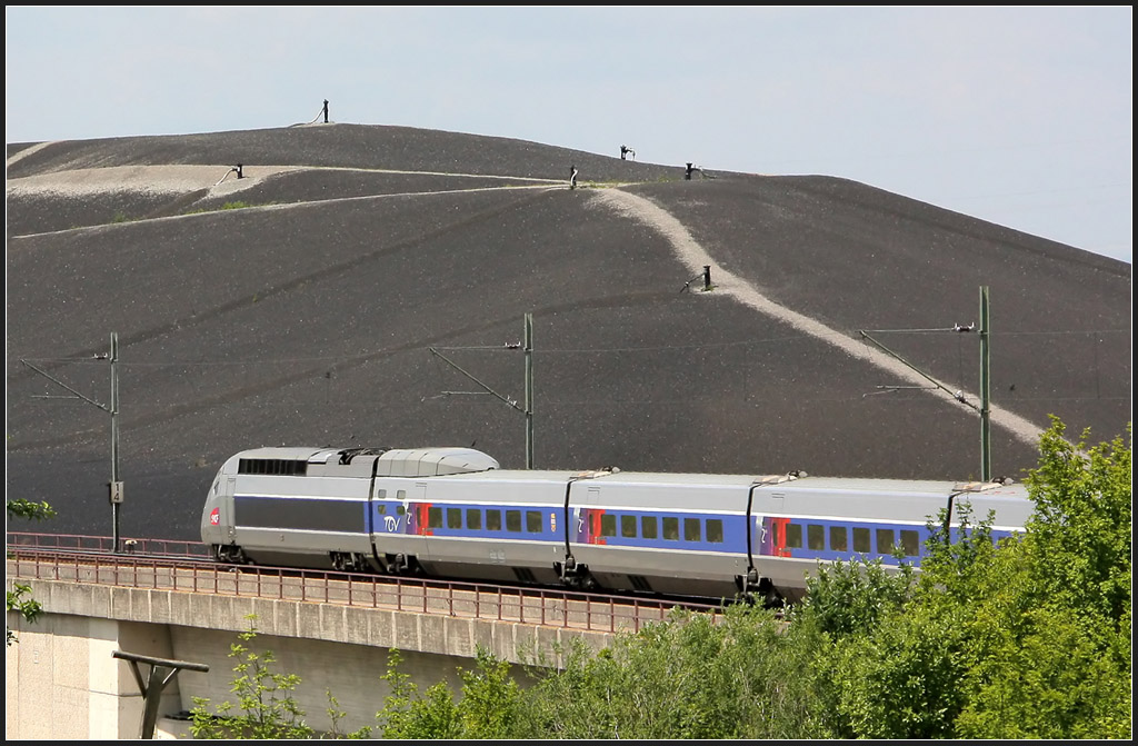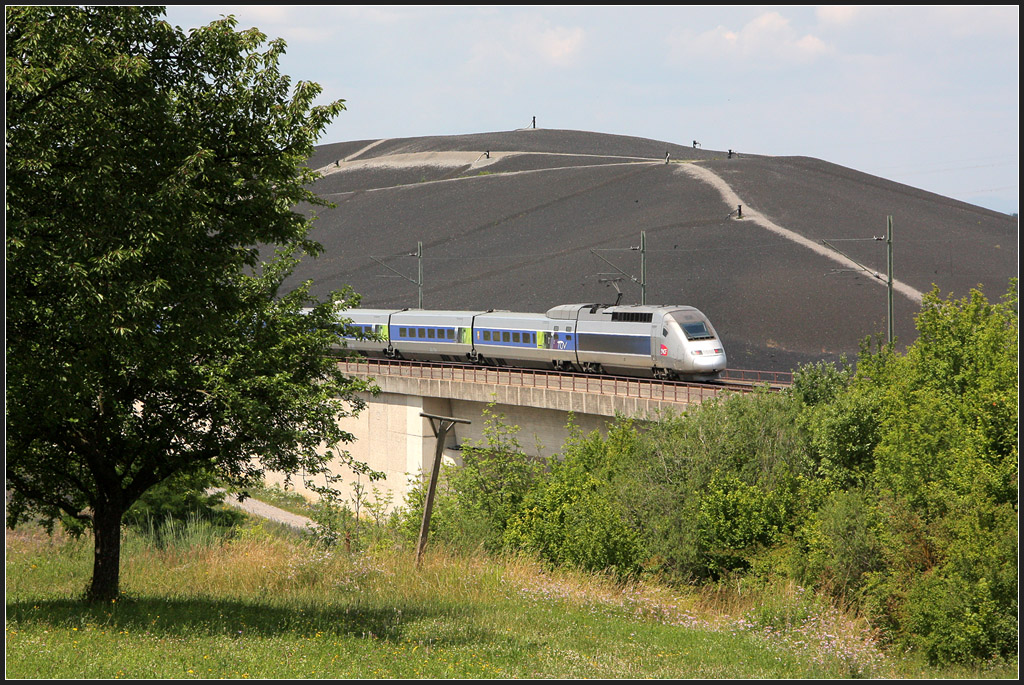 Nachschuss auf einen TGV Stuttgart - Paris in der "Müllkippenkurve". Als wir diesen Fotostandort entdeckten, stand der Zug noch im Stuttgart-Hauptbahnhof, aber lieber ein Nachschuss auf einen TGV als eine Aufnahme eines IC mit Steuerwagen voraus.
