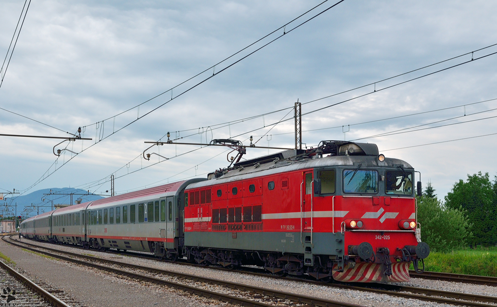 S´ 342-025 zieht EC158 'Croatia' durch Pragersko Richtung Wien. /22.6.2012