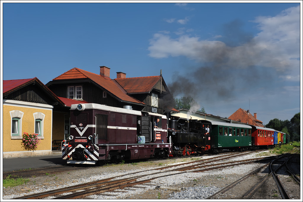Um im Bedarfsfall bei Ausfall der Dampflok auf der Stainzer Bahn gerüstet zu sein, wurde im Vorjahr die mit rund 500 PS ziemlich leistungsstarke rumänische Diesellok L45H-070 angeschafft. Nach der Zulassung im Mai 2012 erfolgten im Juni einige Probe- und Belastungsfahrten. Bei den Belastungsprobefahrten wurde die Lok immer dem planmäßigen Dampfzug, welcher Mittwoch, Freitag, Samstag und Sonntag zwischen Stainz und Preding verkehrt, bei der Retourfahrt ab Kraubath vorgespannt. Auch am 27.6.2012 war dies der Fall. Die Aufnahme zeigt den Zug bei der Einfahrt in Stainz.