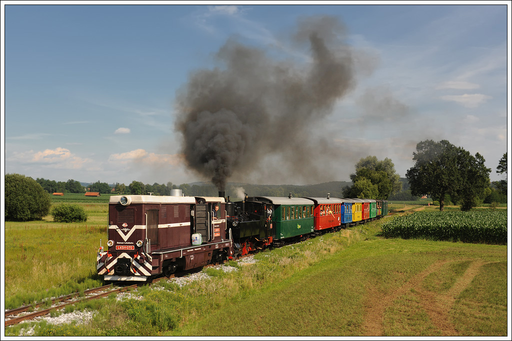Um im Bedarfsfall bei Ausfall der Dampflok auf der Stainzer Bahn gerüstet zu sein, wurde im Vorjahr die mit rund 500 PS ziemlich leistungsstarke rumänische Diesellok L45H-070 angeschafft. Nach der Zulassung im Mai 2012 erfolgten im Juni einige Probe- und Belastungsfahrten. Bei den Belastungsprobefahrten wurde die Lok immer dem planmäßigen Dampfzug, welcher Mittwoch, Freitag, Samstag und Sonntag zwischen Stainz und Preding verkehrt, bei der Retourfahrt ab Kraubath vorgespannt. Auch am 27.6.2012 war dies der Fall. Die Aufnahme zeigt den Zug kurz vor der Haltestelle Neudorf/Stainztal.