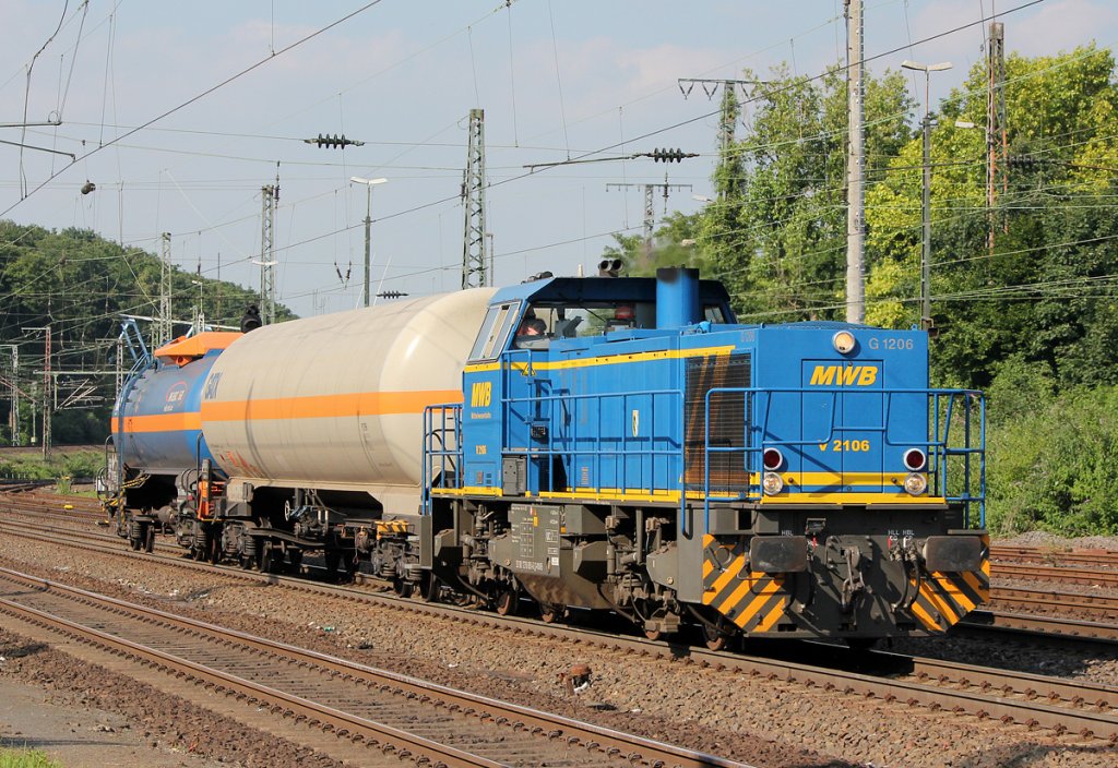 V2106 der MWB mit kurzem Kesselwagenzug in Köln West am 26.06.2012