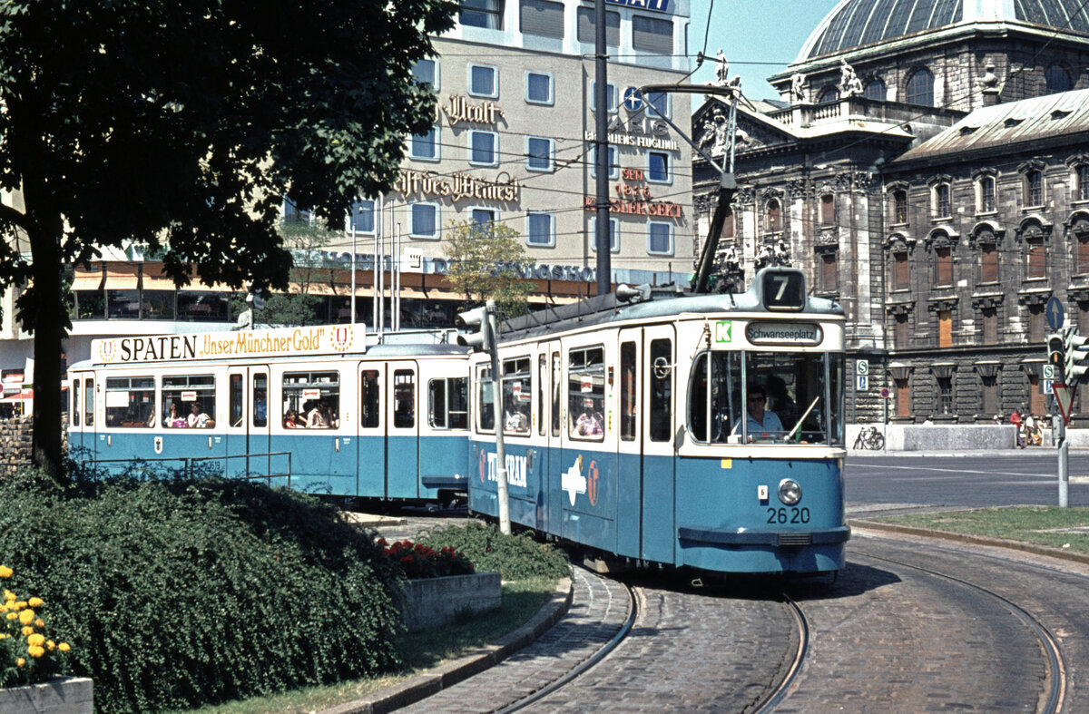 München MVV Tramlinie 7 (M5.65 2620) Karlsplatz am 17. August 1974. - Scan eines Diapositivs. Kamera: Minolta SRT-101.