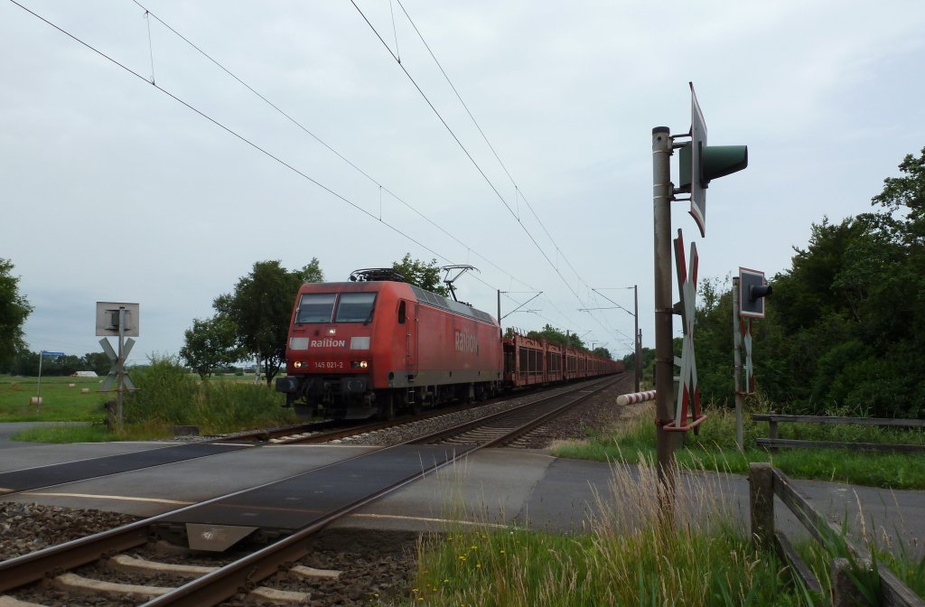 145 023-6 PRESS (145 083-2) "125 Jahre Fleischmann" mit der Wagenlok 253 015-8 und einem ERR GmbH Eanos Ganzzug bei Nennhausen und fuhr in Richtung Rathenow weiter. In Rathenow wurde die 145 023-6 abgekoppelt und die 253 015-8 fuhr dann mit dem Zug weiter nach Brandenburg Altstadt und die 145 023 fuhr Lz nach Stendal. 29.06.2012