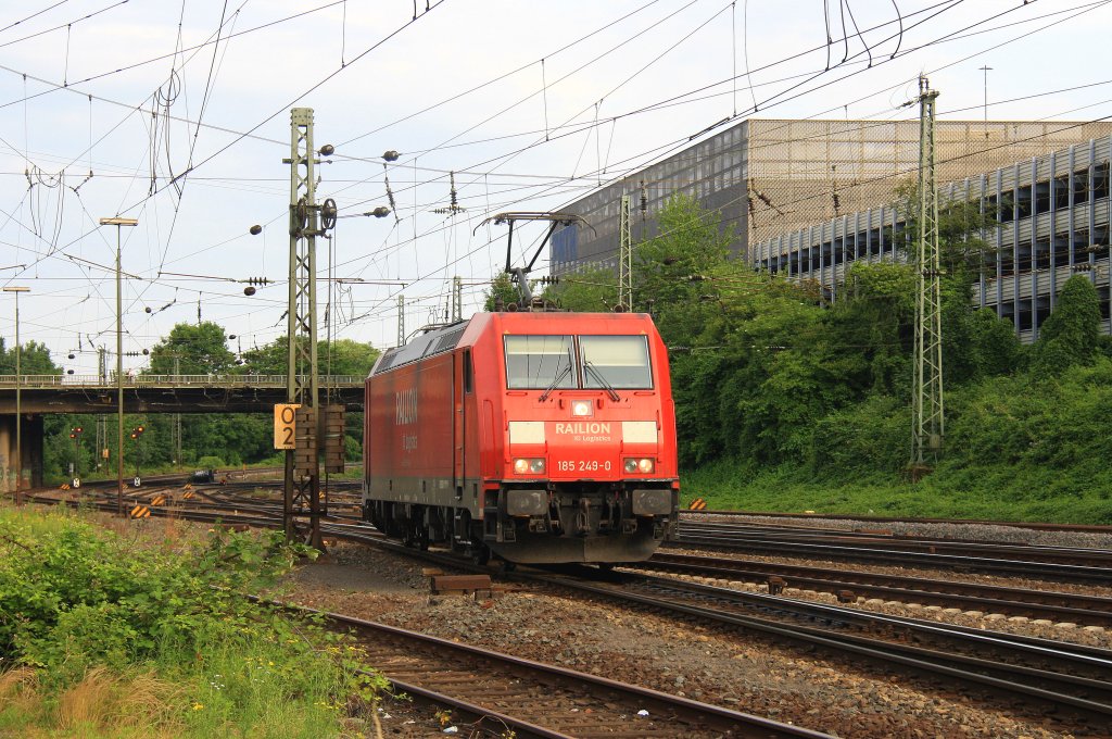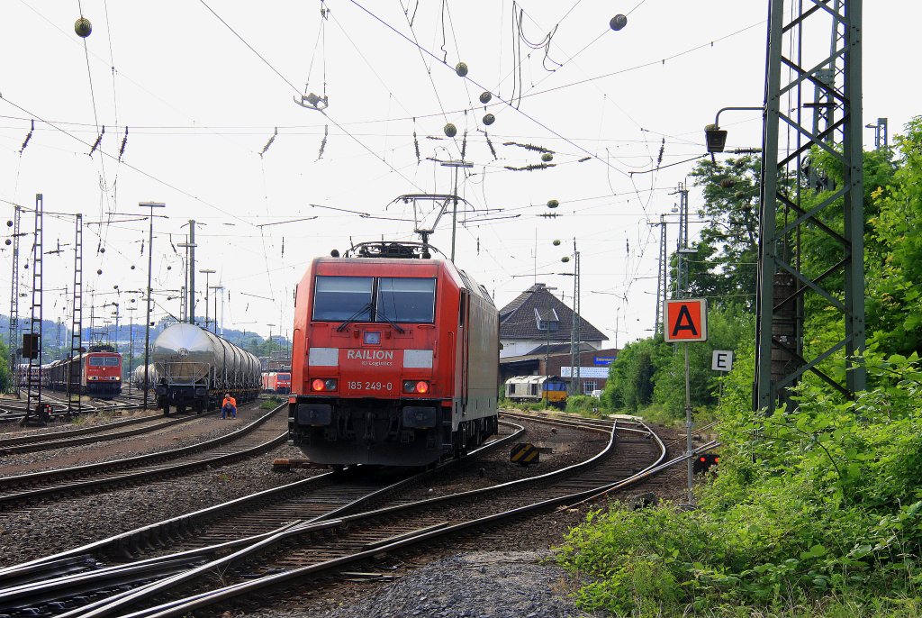 185 249-0 von Railion kommt als  Schubhilfe von dem Gemmenicher-Tunnel und fährt in Aachen-West ein bei Sommerwetter am 28.6.2012.