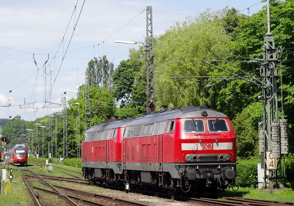 218 400-0 und 218 416-6, die kurz zuvor den EC 194 von München kommend nach Lindau brachten, beim Rangieren auf dem Bodenseedamm, um an die Wagen des EuroCity 195 anzukuppeln und diese nach München zu ziehen (Lindau, 09.06.2012). Dieses sowie die nachfolgenden zwei Bilder wurden vom Ende des zwischen den Gleisen 3 und 4 liegenden Bahnsteigs gemacht.