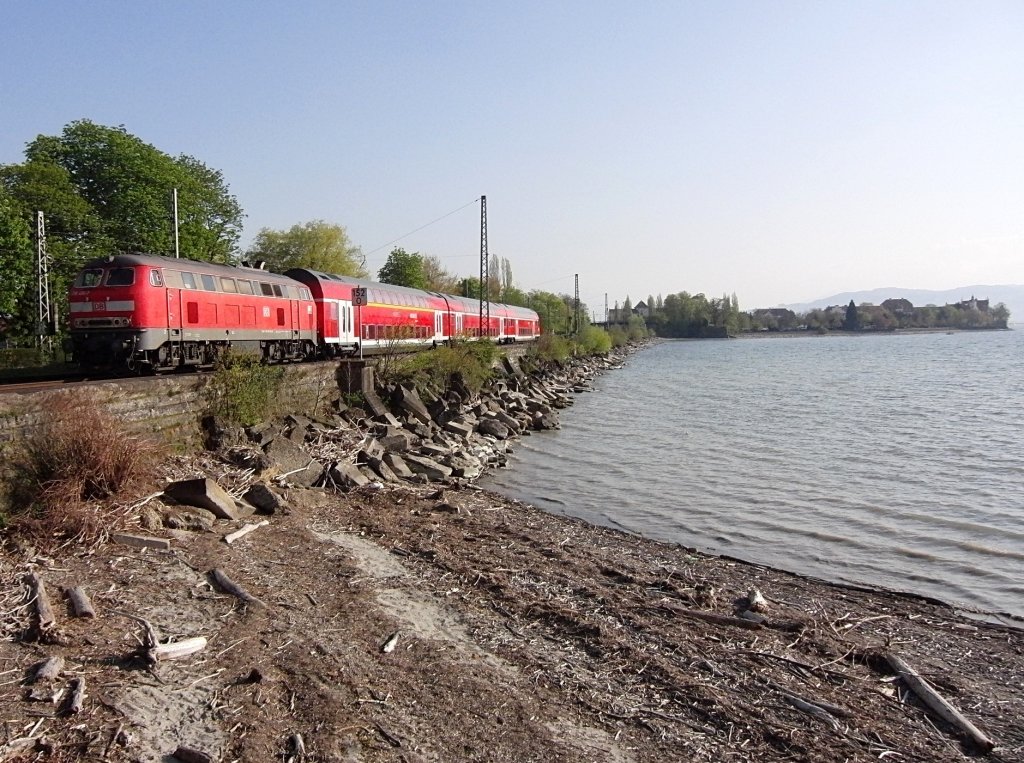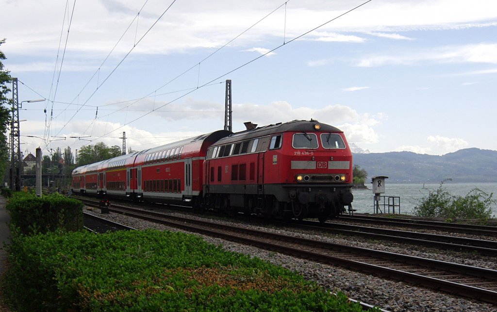 218 438-0 mit IRE 4236 hat gerade seinen Startbahnhof Lindau verlassen und befindet sich auf der Fahrt nach Stuttgart am 29.04.2012 auf dem Bodenseedamm.