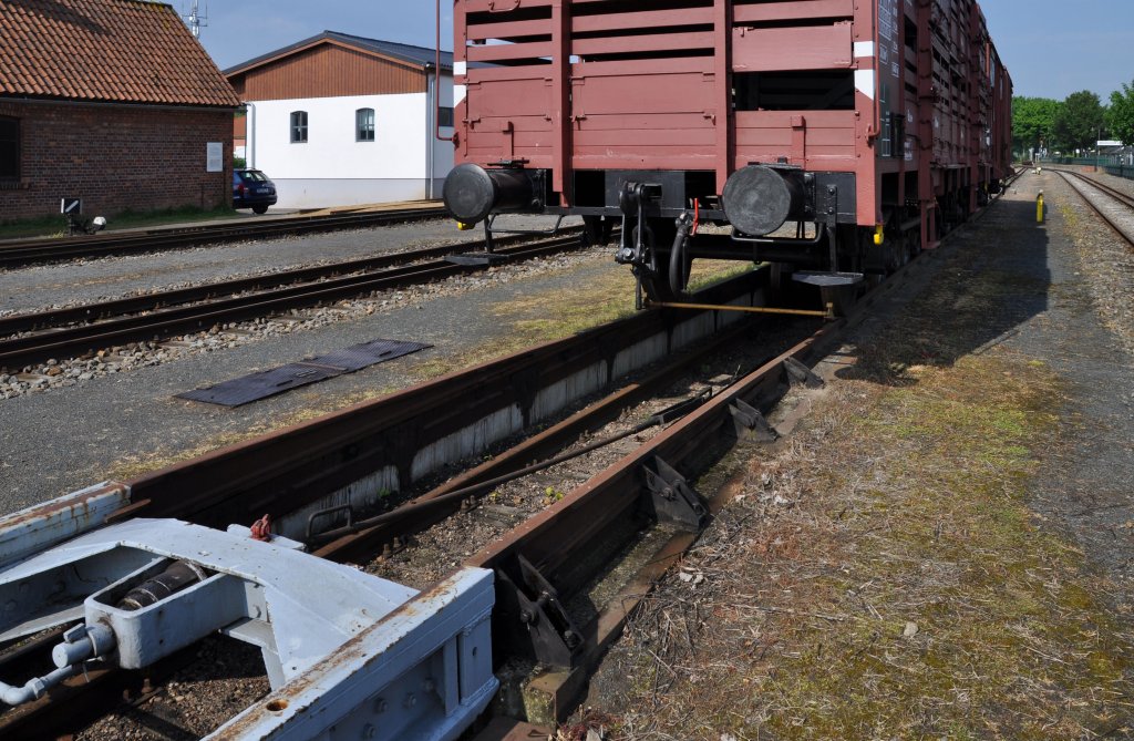24.05.10 , Bruchhausen-Vilsen ; noch einmal der Rollwagen am Anschlöuss zum Regelspurgleis. Gegen Wegdrücken ist der Wagen noch in der Grube verankert.