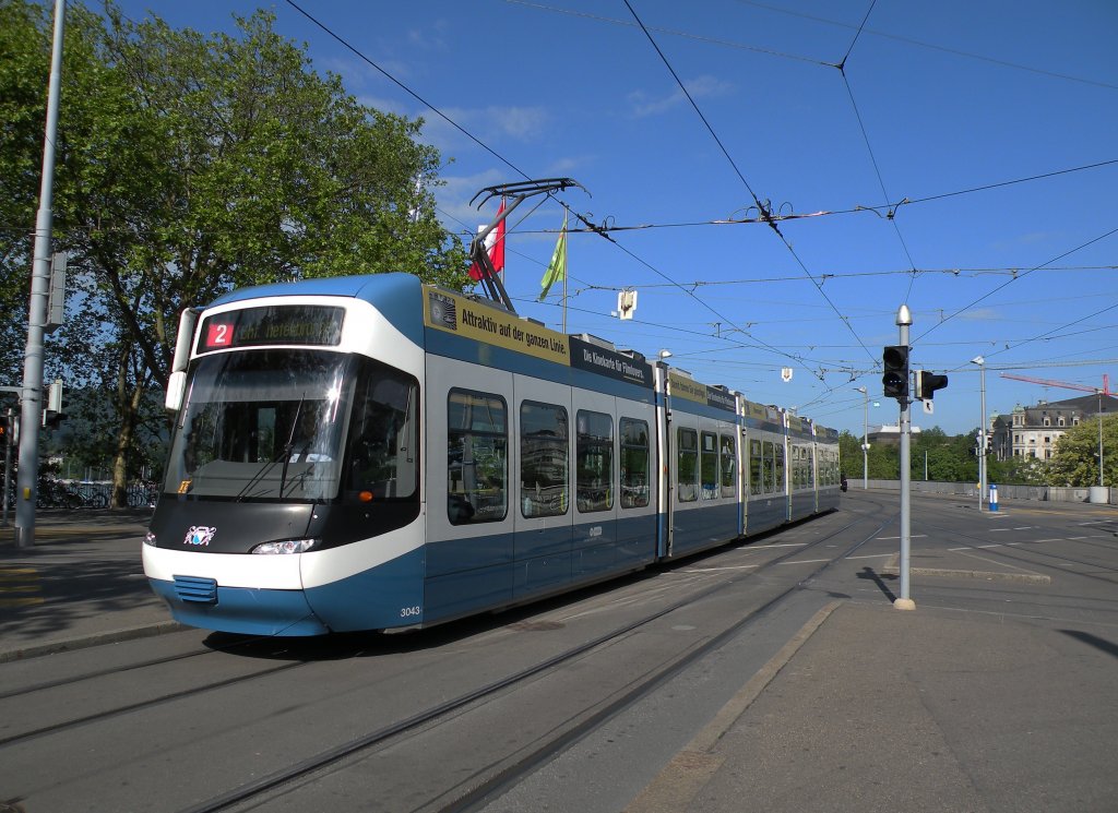 Be 5/6 Cobra mit der Betriebsnummer 3043 auf der Linie 2 am Bellvue. Die Aufnahme stammt vom 23.06.2012.
