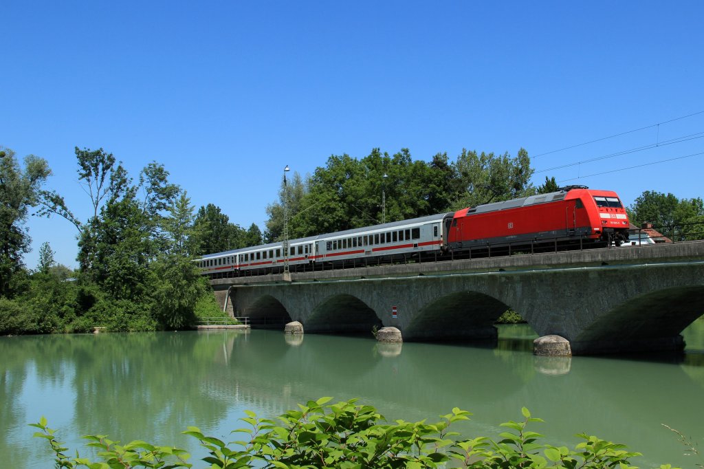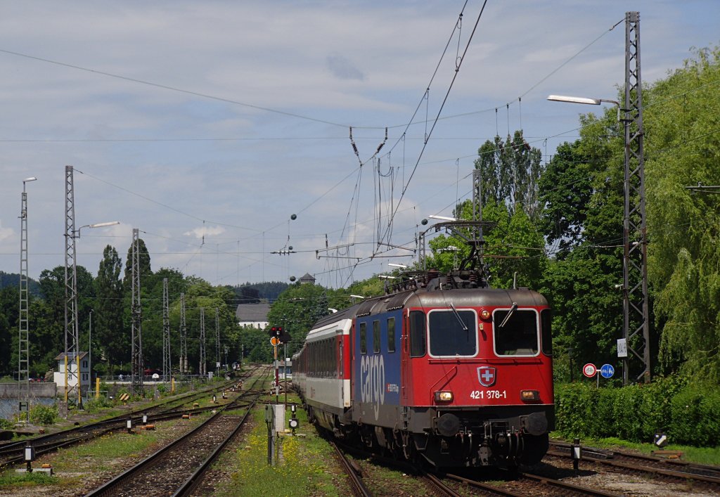 Den Bodenseedamm überquerend zieht Re 421 378-1 die Wagen des EuroCity 195 von Zürich kommend in den Bahnhof von Lindau (09.06.2012).