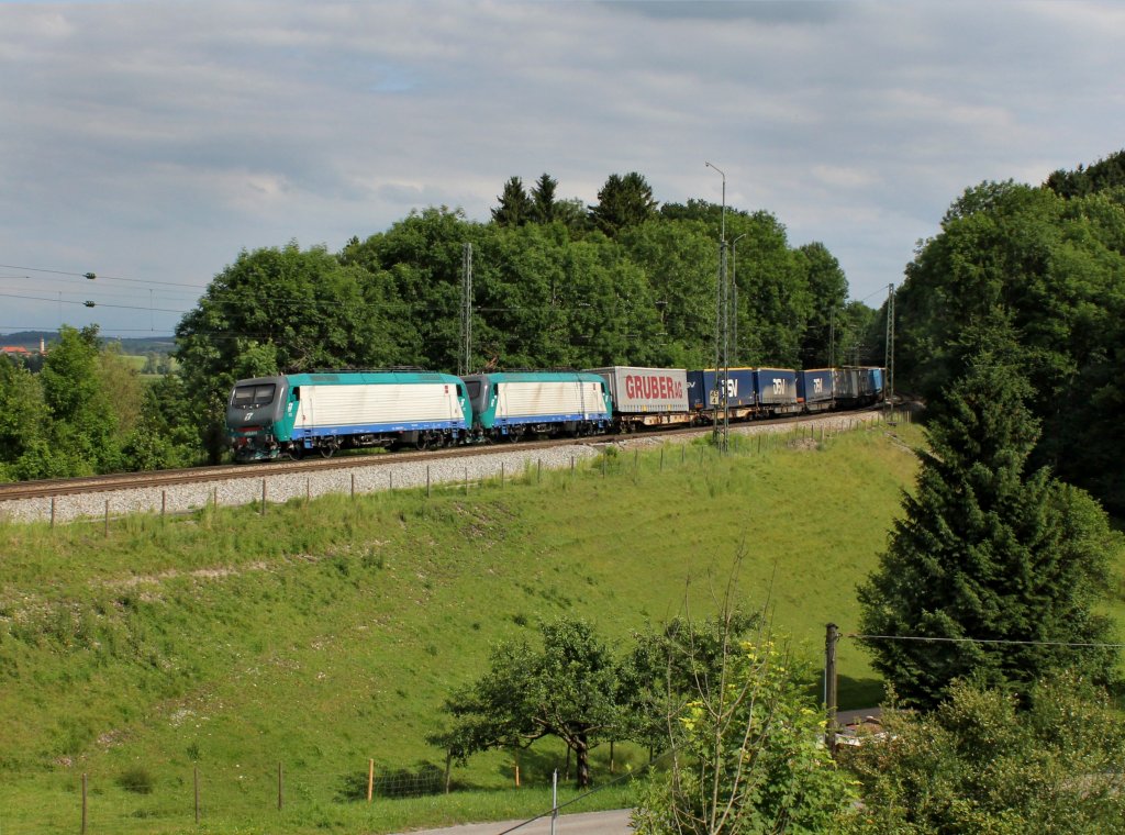 Mit dem Papierzug 48930 sind 185 370 + 185 348 am 29.06.2012 in Kirchdorf/Kr. durchgefahren.