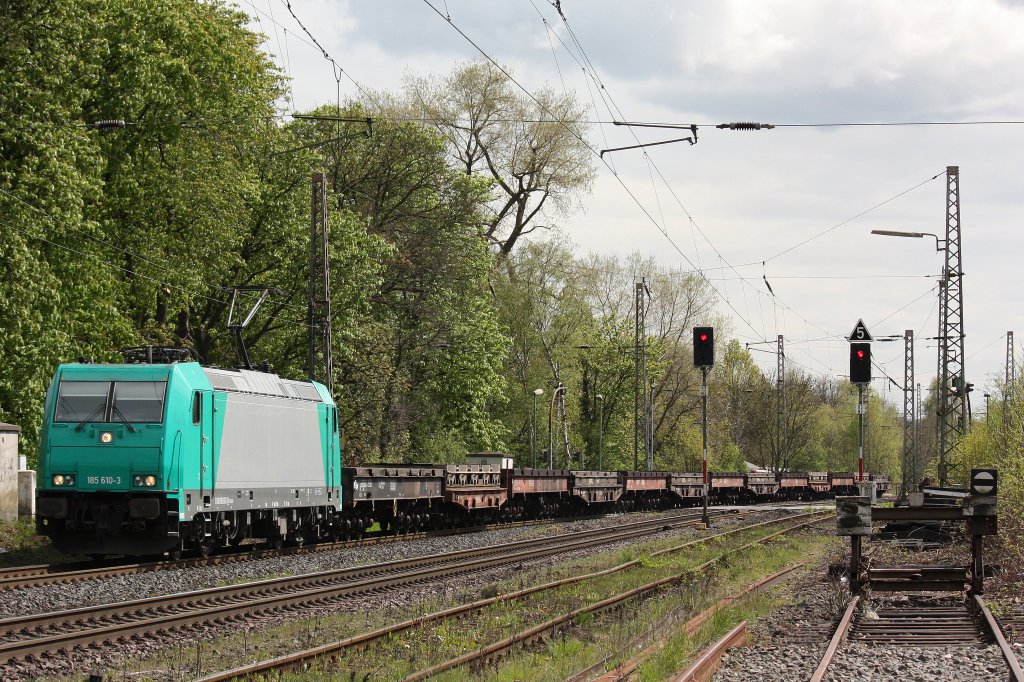 Schenker Mietlok 185 610 am 23.4.12 mit dem leeren  Neuwider Stahlzug  nach Oberbausen-West bei der Durchfahrt durch Ratingen-Lintorf.