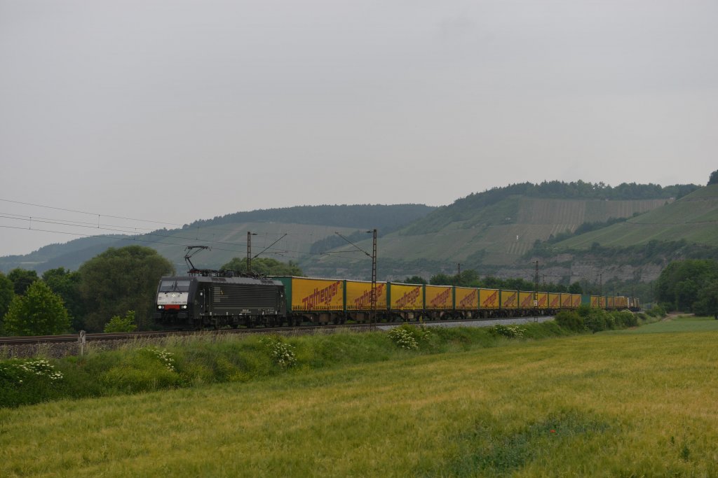 189 909 von TXL mit einem Schiebewandwagenzug Richtung Gemünden am 02.06.2012 unterwegs bei Himmelstadt.
