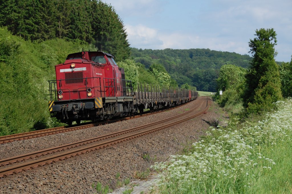 203 007-0 der BEG zieht hier den nur noch als Spot-Leistung, durch das Weserbergland verkehrenden Kupferleerzug Hettstedt - Lünen-Süd bei Istrup gen Altenbeken die Egge hinauf, 02.06.2012.