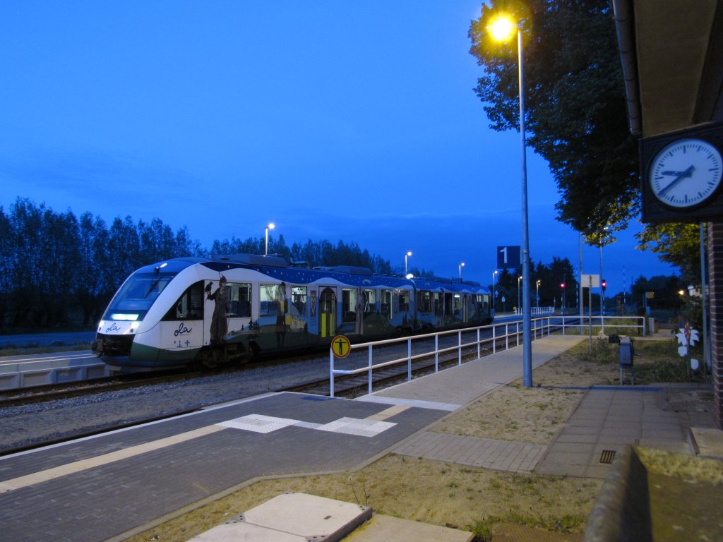 Abends im Bahnhof von Plate wartet VT 702 der OLA Schwerin auf seine Weiterfahrt nach Schwerin am 13.05.2012
