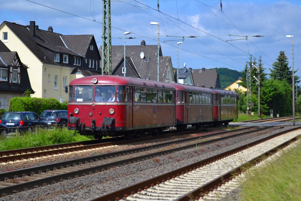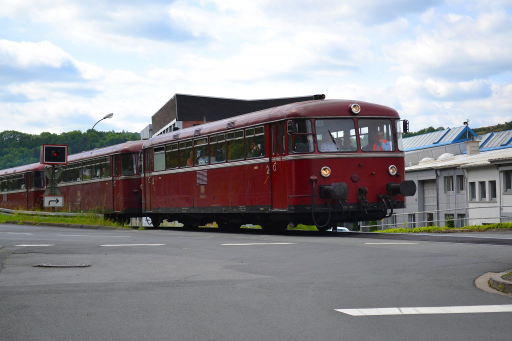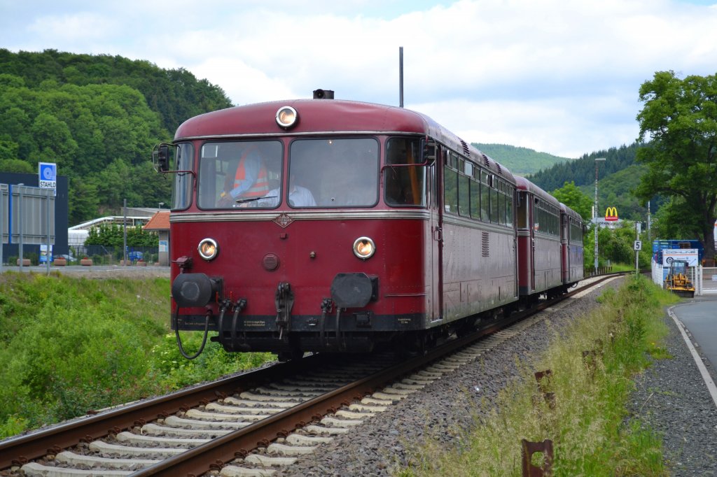 Am 2. Juni 2012 befuhr die DGEG im Rahmen einer Sonderfahrt das nur noch im Güterverkehr betriebene Reststück der Dietzhölztalbahn mit einem dreiteiligen Uerdinger Schienenbus. Das Bild entstand an einem Bahnübergang unterhalb der Dillenburger Stahlwerke.