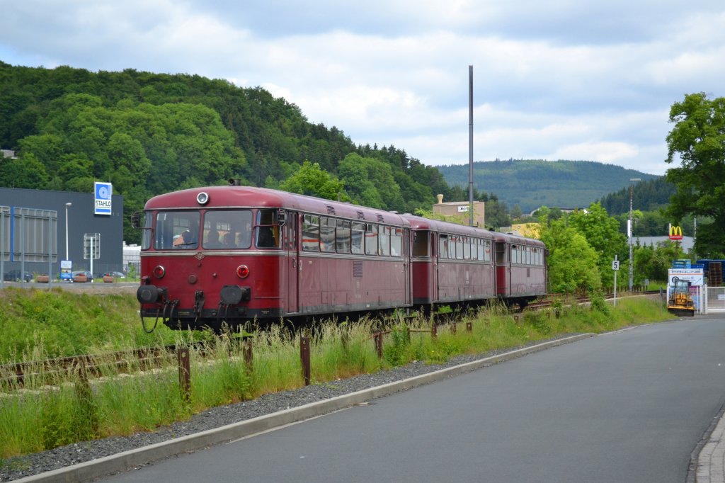 Am 2. Juni 2012 befuhr die DGEG im Rahmen einer Sonderfahrt das nur noch im Güterverkehr betriebene Reststück der Dietzhölztalbahn mit einem dreiteiligen Uerdinger Schienenbus. Das Bild entstand unterhalb der Dillenburger Stahlwerke.