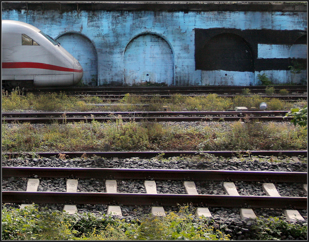 An der blauen Wand entlang - Zu dem ruppigen Bahnambiente passt auch der schemenhaft erkennbar Zaun, im Vorschaubild stärker sichtbar als im Großbild. Ein ICE 1 kurz vor der Durchfahrt des Bahnhofes Stuttgart-Bad Cannstatt. Ein erste Version dieser Aufnahme wurde abgelehnt. Der Bildschnitt wurde dann nochmals neu überdacht (enger geschnitten) und dann kam es durch. 20.10.2011 (M)
