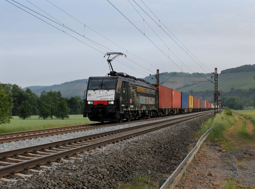 189 932 mit einem Containerzug Richtung Würzburg am 02.06.2012 unterwegs bei Himmelstadt.