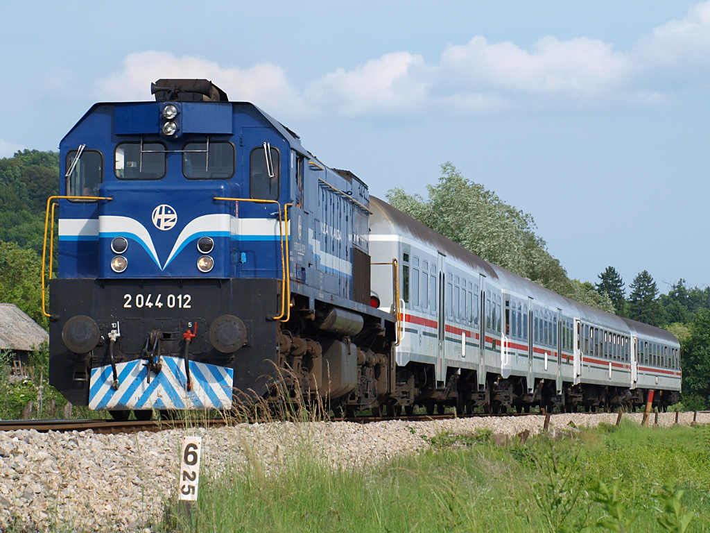 Diesellok 2044 012 mit Personenzug Richtung Zagreb bei der Einfahrt in Zabok / 03.06.2012.