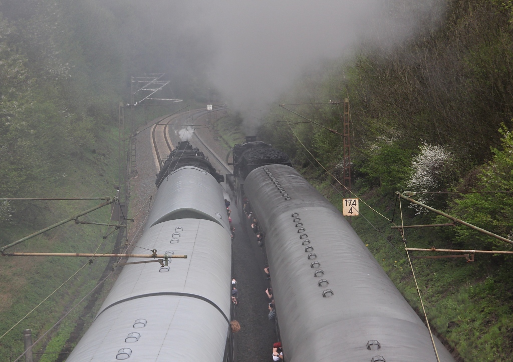 Und dann kam sie: Die erste Parallelfahrt von Bebra nach Sontra mit 50 3610-8, 03 1010 und 211 019-5. An dieser Stelle hatten wir sogar noch Glück, denn vor Cornberg war es, aufgrund einer Fehldisposition, vorbei mit der Parallelfahrt. Aufgenommen am 28.04.2012 bei Braunhausen.