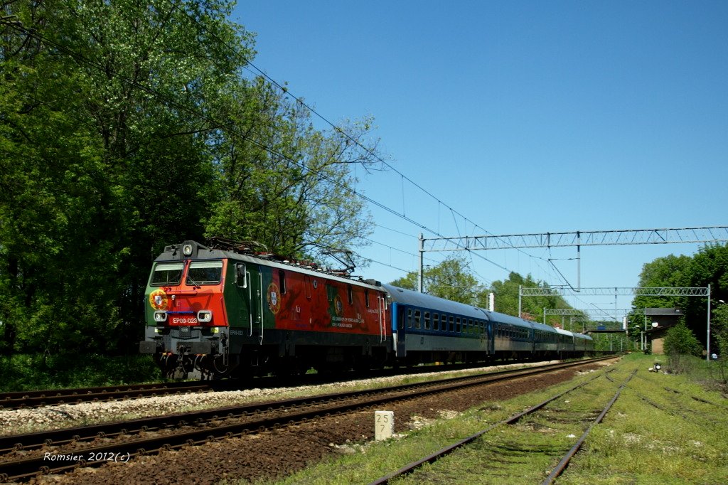 EP09-026 das PKP Intercity in den Landesfarbenn Der Italien mit dem Zug EC 103 POLONIA Warschau Ostbhf-Villach Hbf in Tichau(Oberschlesien).PKP Intercity strichch in der Landesfarbenn der Teilnehmer EURO 2012 sechzehn Stucke E-loks EP09 und aller E-loks Taurus.