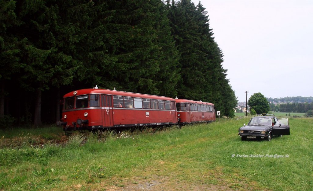 Bei diesem Bild befindet sich das Wälderbähnle an der gleichen Stelle wie beim vorherigen Bild, ist allerdings in der Gegenrichtung unterwegs. Diesellok 2091.08 wird nach 500 Metern ihre Wagen in den Bahnhof Schwarzenberg ziehen. Bei dieser Ansicht befindet sich der Misthaufen hinter dem Zug (03.06.2012).
