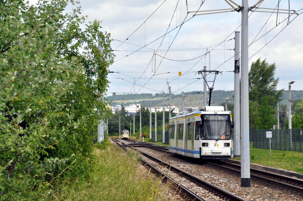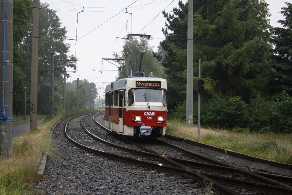 TW 509 an der Schleife in Schönau bei einer der Sonderfahrten zum Straßenbahnfest bzw. 90 Jahre Omnibus Chemnitz. Die Tram mußte mehrmals drehen und in das andere Gleis ausweichen und somit auch ein längeres Stück rückwärts fahren wie auf dem Bild erkennbar, da der Rest der Strecke zum Chemnitzer Zentrum im Moment abgekappt ist, durch Gleiserneuerungsarbeiten auf der Zwickauer Str.! 03.06.2012