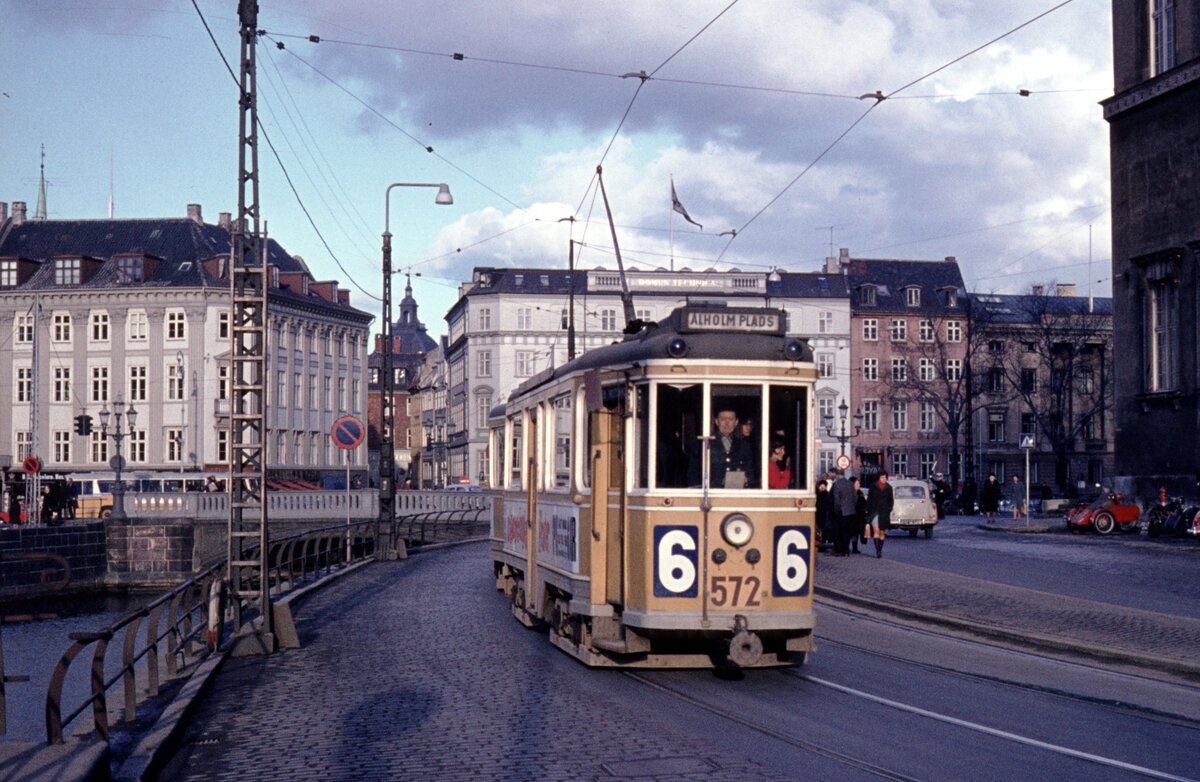 København / Kopenhagen Københavns Sporveje (KS) SL 6 (Großraumtriebwagen 572) København K, Slotsholmen, Vindebrogade / Højbro (: Hohe Brücke) / Christiansborg Slotskirke (: Schlosskirche)) im April 1969. - Scan eines Diapositivs.