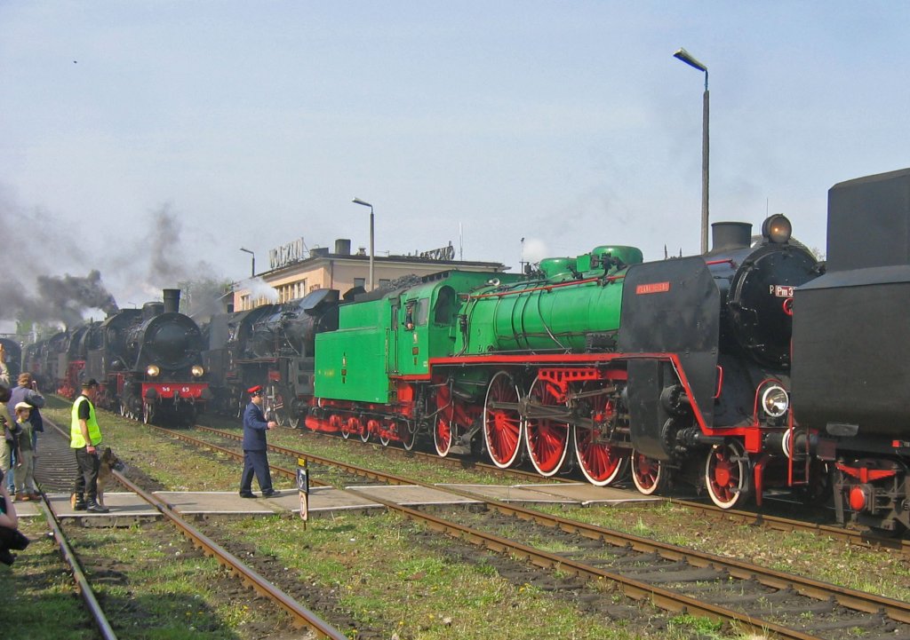 01.05.04 , Wolsztyn ; Dampflokparade ; der Dirigent hat sein Orchester für Abdampfschläge und Dampfpfeifen zusammengestellt.