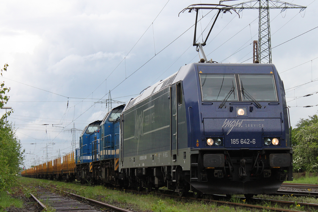 185 642 zog am 9.5.12 zwie Spitzke Loks und einen Bauzug durch Ratingen-Lintorf.