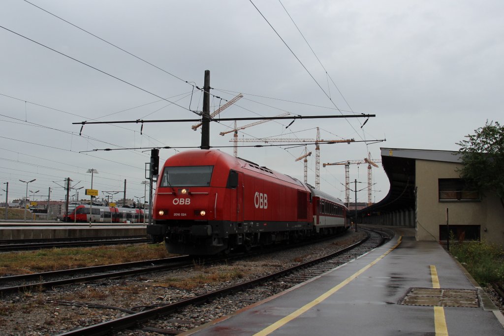 2016 024 verlässt mit dem REX 2528  Marchfeldwiesel  den Zugausgangsbahnhof und Großbaustelle Wien Südbahnhof (Ostbahn) nach Bratislava Hl. st. über Stadlau und Marchegg; am 04.06.2012