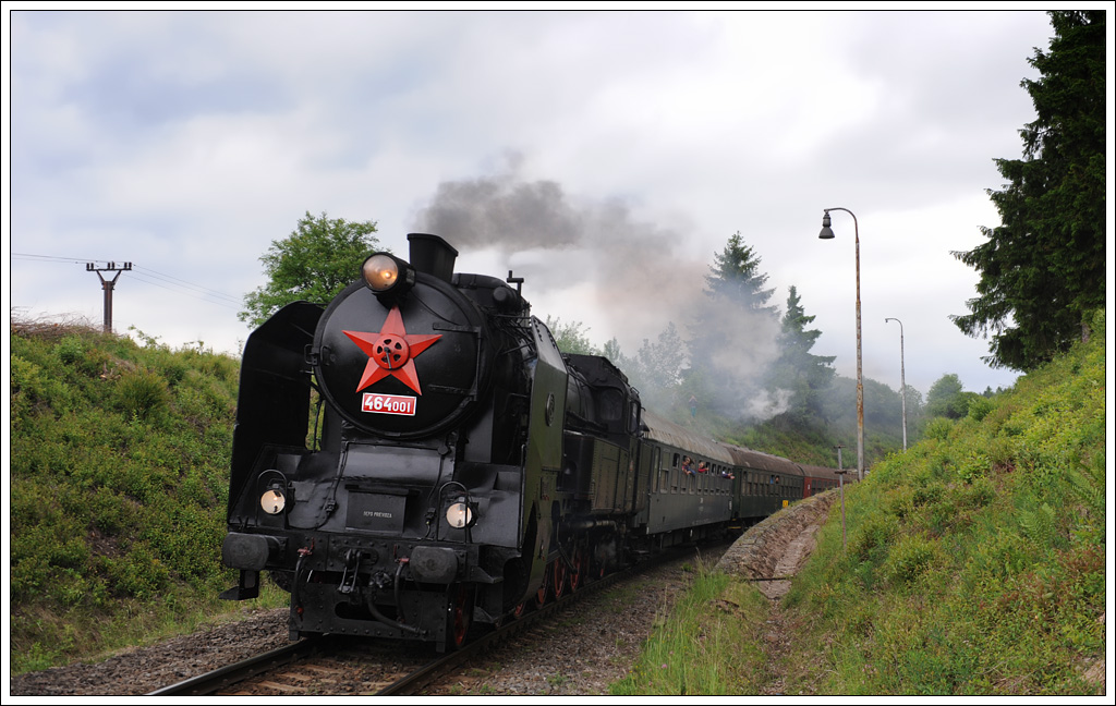 In Zvolen kam dann am 1.6.2012  475 179 an die Spitze und 475 196 fungierte als Zuglok. Die Aufnahme zeigt den ab Zvolen als Os 31208 verkehrenden Sonderzug retour nach Vrútky kurz vor dem Bahnhof Kremnica.