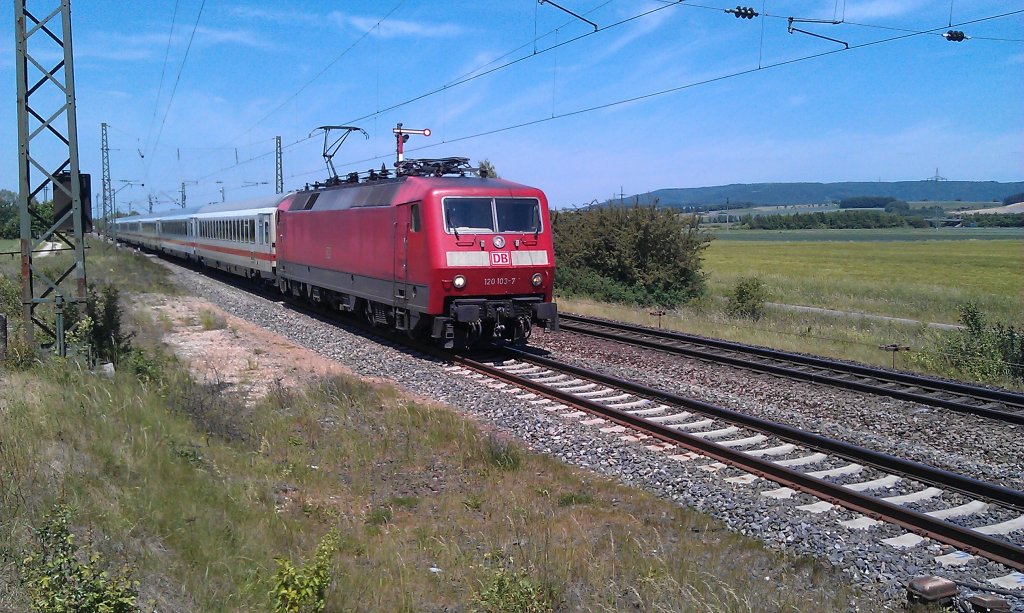 120 103 mit IC-Garnitur am 26.05.2012 in Neuses an der Regnitz.