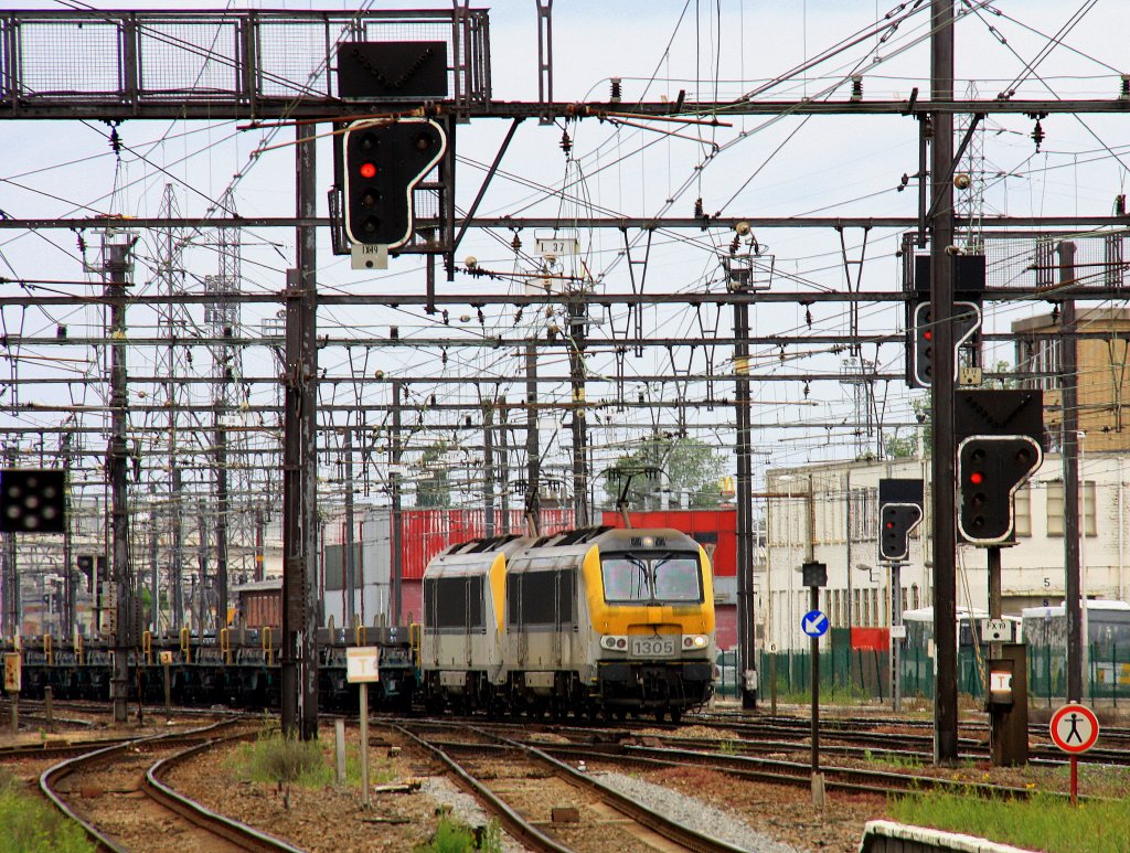 1305 und 1324 von der SNCB fahren mit einem Stahlzug und fahren durch Hasselt(B) und fahren in Richtung Tongeren(B) bei Wolken am 7.6.2012.