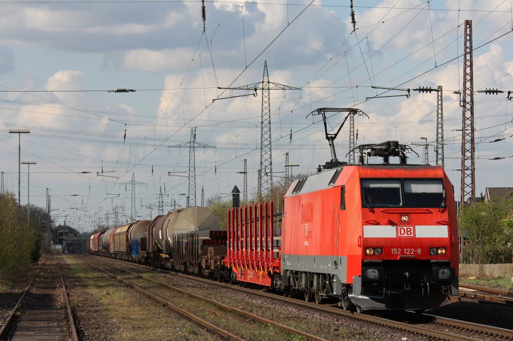 152 122 am 12.4.12 mit einem gemischten Güterzug bei der Durchfahrt durch Ratingen-Lintorf.