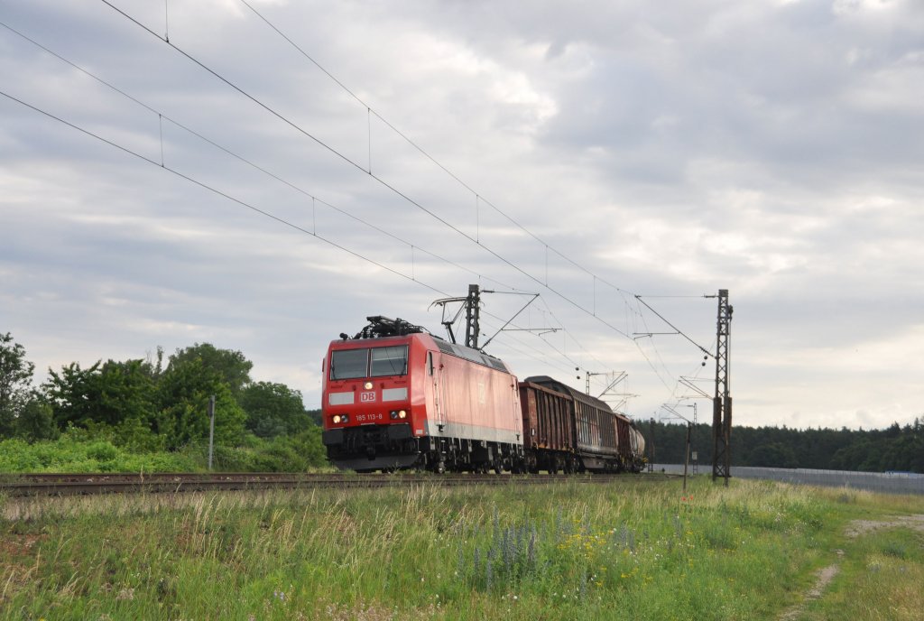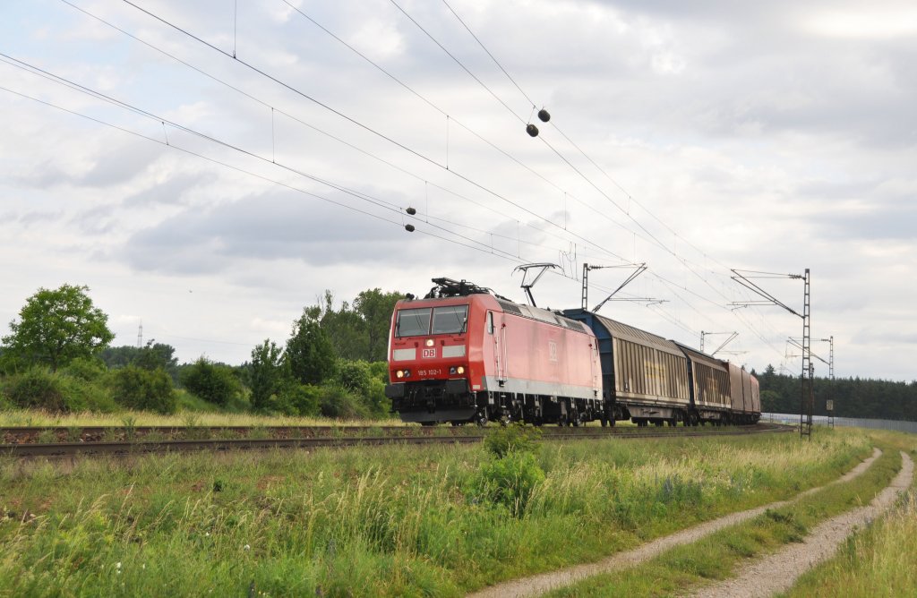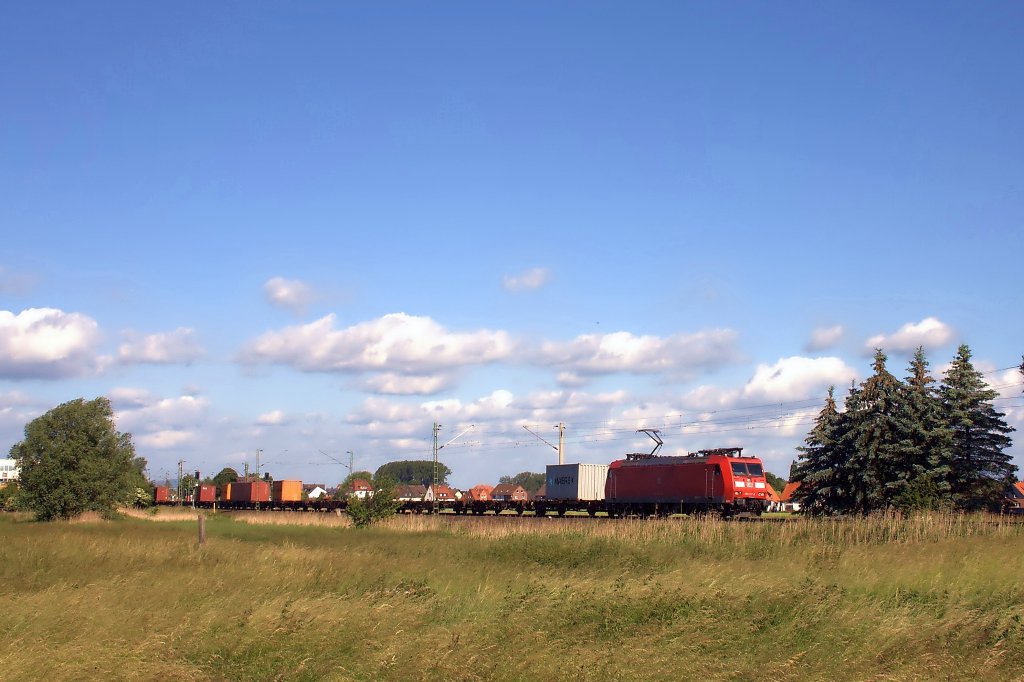 185 112 zieht am 09.06.'12 einen Containerzug durch das Örtchen Emmerke richtung Osten