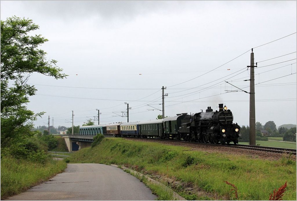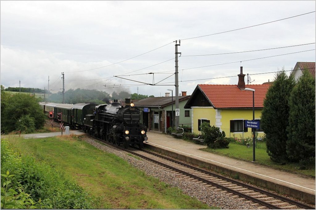 Am 9. Juni 2012 wurden auf der Franzl-Bahn zwischen Wien/Heiligenstadt und Sigmundsherberg zwei Dampf-Sonderzüge in Verkehr gesetzt. Den zweiten Zug machte die altehrwürdige, 100-jährige Lokomotive 310 23 als Zug SR14760 und ist hier kurz vor ihrem Fotohalt in Kritzendorf in der Kritzendorfer Au in Fahrt.