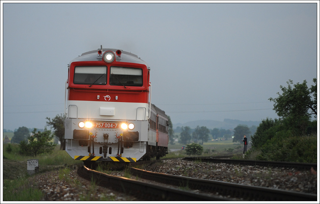 Auch der Planverkehr wurde am vergangenen Wochenende etwas dokumentiert. Im September 2011 hatte die erste 757er (757 001) der ZSSK ihre erste offizielle Fahrt. Die 757er wurden u.a. mit einem Caterpillar-Dieselmotor remotorisiert, erhielten Kameras statt Außenspiegel und auch die Führerstände wurden klimatisiert. Mit ihren rund 2110 PS und einer Höchstgeschwindigkeit von 100 km/h wird sie heute im mittelschweren Streckendienst auf nicht elektrifizierten Strecken der ZSR mit Länge bis 300 km eingesetzt. Das Foto zeigt 757 004 mit einem Personenzug am 2.6.2012 kurz vor der Haltestelle Ko¨ťany nad Turcom. Ca. zehn 750ger und 754er sollen von ´OS Zvolen auf 757er umgebaut werden. Noch eine Version von dieser Stelle, die mir persönlich sogar besser gefällt. Die Version von Tom mit dem Übertele schlägt allerdings alles!