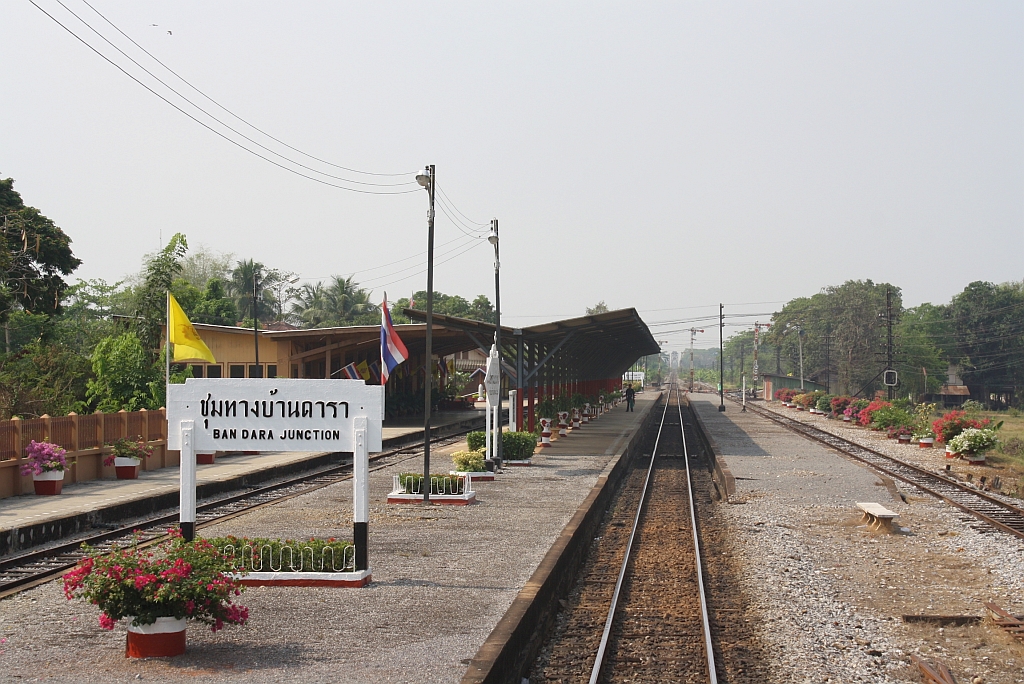 Nördliche Einfahrtsbereich des Bf. Ban Dara Junction, Blickrichtung Bangkok, am 15.März 2012.